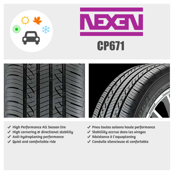 Every season is the right season for the Nexen CP671 tire. Wet weather driving is made safer due to straight wide grooves to deter hydroplaning and increase wet traction. A quiet, comfortable ride with great traction and braking are the results of a lateral and rapid angle round groove design.